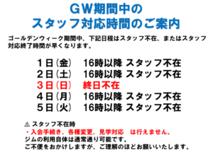 ゴールデンウィーク期間中、下記日程はスタッフ不在、またはスタッフ対応終了時間が早くなります。